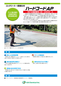 【合成樹脂系被膜型養生剤】 ●AP(白色) ・一貫性養生が可能 マット散水養生と同等の養生性能を示しますので、マットの使用を省略することが出来ます。 飛行場や高速道路など屋外のコンクリート打設物の養生に適しています。 ・ライン付着良好 路面標示用塗料との付着が良い皮膜を形成しますので、養生後に被膜の除去が不要です。 ・養生後自然な風合い 形成する皮膜は無色透明なので、コンクリートの外観は自然な風合いのままです。 ●PRO WX(乳白色:白色顔料入り) ・一貫性養生が可能 マット散水養生と同等の養生性能を示しますので、マットの使用を省略することが出来ます。 ・ASTM C 309 Type 2 適合品 白色顔料を含んだ被膜がコンクリート面からの水分蒸発と、直射日光の吸収を低下させますので、 米軍関連のコンクリート打設物の養生に適しています。 ●AA(乳白色) ・立ち上がり面に使用可能 粘性があり、マット散水養生の困難な立ち上がり面の養生に使用できます。 ・耐候性に優れた被膜を形成 アクリル系の合成樹脂を主成分としておりますので、形成された被膜は耐候性が良好です。 ●CL-E-1(乳白色) ・仕上がりがキレイ 形成する被膜は無色透明なので、屋内のコンクリート打設物の養生に適しています。 ・接着性良好 CL-E-1で養生したコンクリート面は、新たにコンクリートを打ち継ぐ場合にも良好な接着性を有します。 ●CL-E-2(乳白色:白色顔料入り) ・直射日光の吸収を低減 白色顔料が直射日光の吸収を低減し、コンクリートの表面温度上昇を抑制しますので、 飛行場や高速道路など屋外のコンクリート打設物の養生に適しています。 ・目視にて散布状況の確認が可能 白色顔料入りなので、均一に散布されているか目視にて確認できます。 【無機質系浸透型養生剤】 ●クイック(淡青色) ・早い硬化スピード コンクリートのアルカリ成分と結合し硬化層を形成することで、早期にマット養生へ移行できます。 ・コンクリート面のクラック防止 コンクリート中の水分の揮散を防ぎ、コンクリート面のクラックの発生を防止します。 ●SFP(青色) ・内部に浸透し緻密化した層を形成 コンクリート表面から内部に浸透して緻密化した層を形成します。 ・対汚染性、不燃性 シリカ系の無機質化合物は汚れ難く不燃性ですので、高速道路のスリップフォーム防護柵の養生に 適しています。
